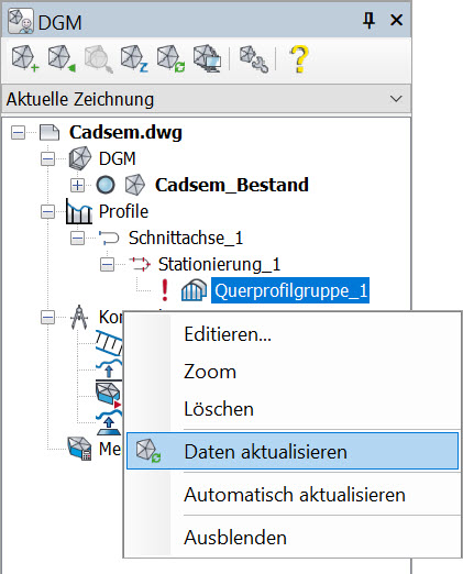 Jedes Profil wird bei Änderungen von Referenzelementen automatisch aktualisiert. Referenzelemente für Profile sind Oberflächen, die zugehörige Schnittachse sowie die Stationierung. Diese Aktualisierung kann jederzeit deaktiviert bzw. aktiviert werden. Die Kennzeichnung nicht mehr aktueller Längsprofile erfolgt durch ein rotes Ausrufungszeichen (!). Bei allen Querprofilgruppen, deren Status auf manuelles aktualisieren gesetzt ist, wird zusätzlich die Funktion Daten aktualisieren im Kontextmenü angezeigt. Mit dieser Funktion können Sie die entsprechenden Profile nun bei Bedarf aktualisieren. Alternativ besteht natürlich auch die Möglichkeit, wieder auf die automatische Aktualisierung zu wechseln. |