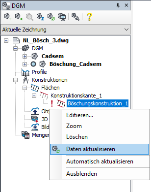 Jede assoziative Böschungskonstruktion wird bei Änderungen von Referenzobjekten automatisch aktualisiert. Referenzobjekte für Böschungskonstruktionen sind Oberflächen und Konstruktionskanten. Diese Aktualisierung kann jederzeit deaktiviert bzw. aktiviert werden. Wenn die automatische Aktualisierung deaktiviert wurde und die Resultate der Böschungskonstruktion nicht mehr dem aktuellen Stand der Referenzobjekte entsprechen, erfolgt eine Kennzeichnung mit einem roten Ausrufungszeichen (!) im Projektbrowser des DGMs. In diesem Fall besteht die Möglichkeit der manuellen Aktualisierung mit der Funktion Daten aktualisieren, welche aus dem Kontextmenü aufgerufen werden kann. Alternativ besteht natürlich auch die Möglichkeit, wieder auf die automatische Aktualisierung zu wechseln. Hinweis: Das rote Ausrufungszeichen (!) steht generell für eine Inkonsistenz der Böschungskonstruktion. Die Gründe hierfür sind vielfältig. |