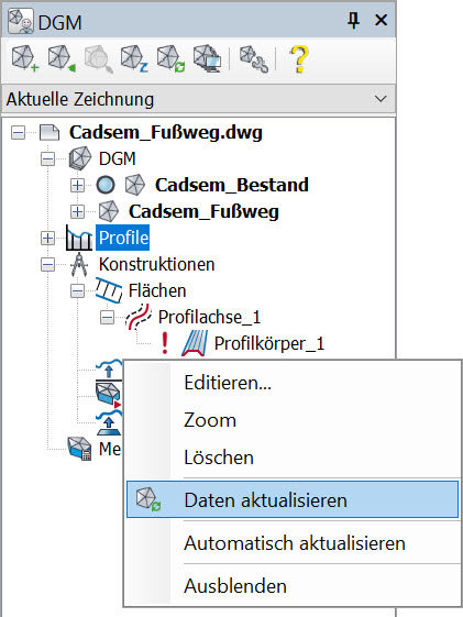 Jeder Profilkörper wird bei Änderungen von Referenzobjekten automatisch aktualisiert. Die Referenzobjekte für einen Profilkörper sind recht vielfältig und damit auch die möglichen Änderungen. Siehe dazu auch das Kapitel Assoziative Objekte. Diese Aktualisierung kann jederzeit deaktiviert bzw. aktiviert werden. Wenn die automatische Aktualisierung deaktiviert wurde und die Resultate eines Profilkörpers nicht mehr dem aktuellen Stand der Referenzobjekte entsprechen, erfolgt eine Kennzeichnung mit einem roten Ausrufungszeichen (!) im Projektbrowser des DGMs. In diesem Fall besteht die Möglichkeit der manuellen Aktualisierung mit der Funktion Daten aktualisieren, welche aus dem Kontextmenü aufgerufen werden kann. Alternativ besteht natürlich auch die Möglichkeit, wieder auf die automatische Aktualisierung zu wechseln. Hinweis: Das rote Ausrufungszeichen (!) steht generell für eine Inkonsistenz des Profilkörpers. Die Gründe hierfür sind vielfältig. |