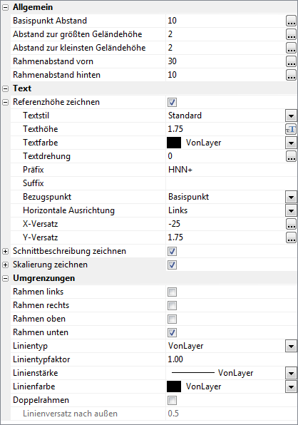 Die Basistabelle beschreibt das Grundgerüst der Schnittdarstellung. Hierzu gehören die grundlegenden Parameter für Rahmendarstellungen und Abstandswerte dieser Rahmenlinien zum jeweiligen Geländeverlauf. Für jeden Parameterwert wird schematisch im oberen Teil der Optionen die Bedeutung der jeweiligen Option angezeigt, sobald diese ausgewählt wird. Jeder Schnitt definiert sich von einem Basispunkt ausgehend. Dieser Basispunkt entspricht dem Einfügepunkt der Tabelle und ist der zentrale Bezug für die Ausrichtung von Texten und Tabellenzeilen.