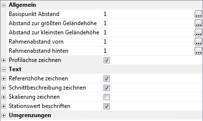 Der Tabelle können Textinformationen für die Referenzhöhe, die Schnittbeschreibung, die Skalierung und den Stationswert hinzugefügt werden, wofür folgende Einstellungen gelten: