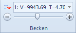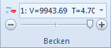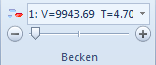 Für ein Einzelbecken können alle Zwischenwerte von 0-100% der Füllung stufenlos angezeigt werden. Dafür steht der Schieberegler unterhalb der Auswahlliste zur Verfügung. Nach links verkleinern sich die Füllwerte und alle zugehörigen Eigenschaftswerte. Nach rechts vergrößert sich die Füllung des Beckens. Das entsprechend ausgewählte Teilergebnis wird grafisch im Viewer zeitgleich angezeigt.