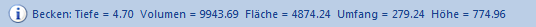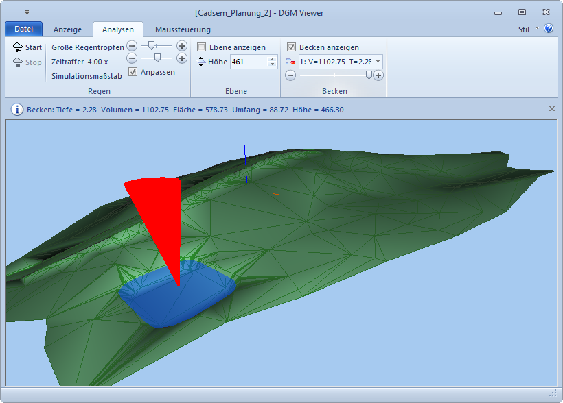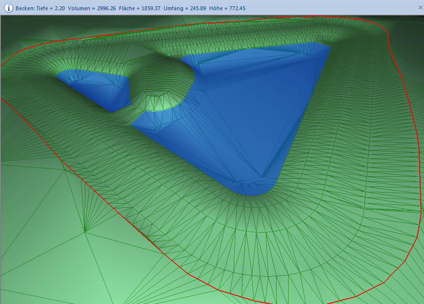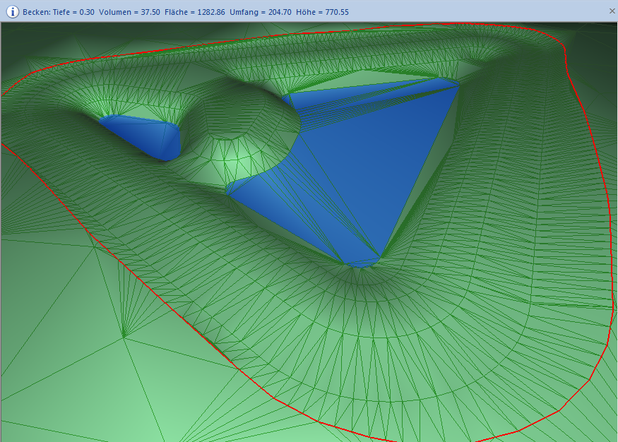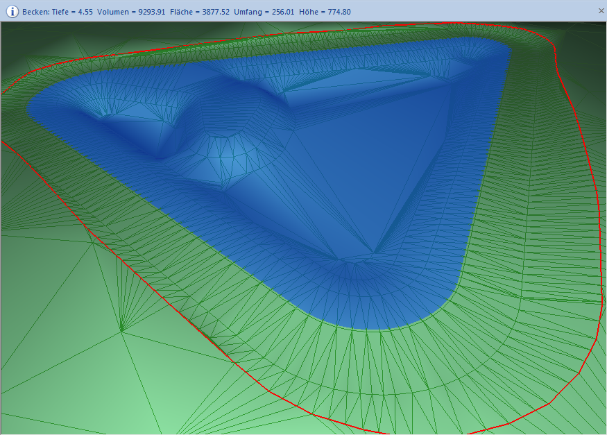Die Position eines einzeln ausgewählten Beckens wird durch einen roten, temporären Pfeil auf der Oberfläche markiert. Zusätzlich werden das Volumen sowie die Tiefe für das ausgewählte Becken in der Auswahlliste angezeigt. Zusätzliche Informationen über die Fläche und den Umfang sowie die Geländehöhe des ausgewählten Beckens werden unterhalb der Multifunktionsleiste des Viewers eingeblendet. |