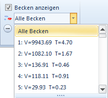Die Analyse von Füllflächen (Becken) erfolgt immer auf der aktuellen Oberfläche und wird durch Aktivieren der Option Becken anzeigen ausgeführt. Alle Füllflächen werden automatisch berechnet und die Ergebnisse in der Auswahlliste angezeigt. Als Vorgabe werden im Ergebnis alle berechneten Becken angezeigt. |
