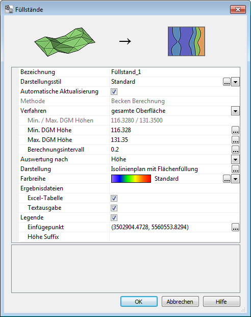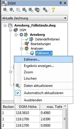 Automatische Aktualisierung -Jede Analyse wird bei Änderungen innerhalb des Oberflächenmodells automatisch aktualisiert. Diese Aktualisierung kann jederzeit deaktiviert bzw. aktiviert werden. Wenn die automatische Aktualisierung deaktiviert wurde, erfolgt eine Kennzeichnung im Projektbrowser des DGMs, wenn sich die Oberflächeninformationen geändert haben. In diesem Fall besteht die Möglichkeit der manuellen Aktualisierung der Analyse mit der Funktion Daten aktualisieren, welche Sie aus dem Kontextmenü aufrufen können.