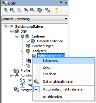 Automatische Aktualisierung -Jede Analyse wird bei Änderungen innerhalb des Oberflächenmodells automatisch aktualisiert. Diese Aktualisierung kann jederzeit deaktiviert bzw. aktiviert werden. Wenn die automatische Aktualisierung deaktiviert wurde, erfolgt eine Kennzeichnung im Werkzeugbereich des DGMs, wenn sich die Oberflächeninformationen geändert haben. In diesem Fall besteht die Möglichkeit der manuellen Aktualisierung der Analyse mit der Funktion Daten aktualisieren, welche Sie aus dem Kontextmenü aufrufen können.