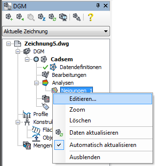 Automatische Aktualisierung - Jede Analyse wird bei Änderungen innerhalb des Oberflächenmodells automatisch aktualisiert. Diese Aktualisierung kann jederzeit deaktiviert bzw. aktiviert werden. Wenn die automatische Aktualisierung deaktiviert wurde, erfolgt eine Kennzeichnung im Werkzeugbereich des DGMs, wenn sich die Oberflächeninformationen geändert haben. In diesem Fall besteht die Möglichkeit der manuellen Aktualisierung der Analyse mit der Funktion Daten aktualisieren, welche Sie aus dem Kontextmenü aufrufen können.
