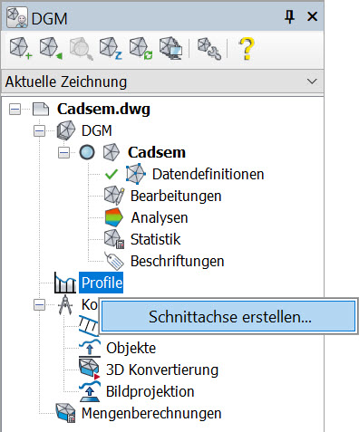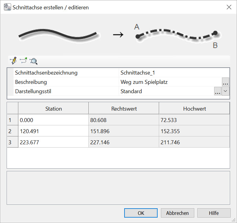Alle Befehle für Schnittachsen befinden sich im Dialogfeld Schnittachse erstellen / editieren, das über das Kontextmenü unter Profile geöffnet wird. Im Dialogfeld stehen die Funktionen über Icons zur Verfügung. Jede Schnittachse erhält eine Bezeichnung, die automatisch vom Programm vorgegeben wird und benutzerdefiniert geändert werden kann. Die Darstellung der Schnittachse in der Zeichnung ist abhängig vom ausgewählten Darstellungsstil.