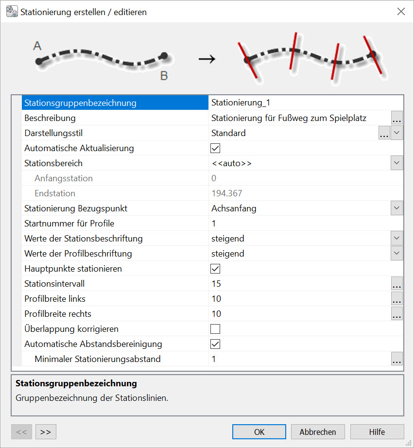 Die Optionen für die Erstellung einer Stationierung befinden sich in einem Dialogfeld tabellarisch aufgelistet. Eine neue Stationierung wird über die Auswahl der zugehörigen Schnittachse im Projektbrowser und anschließender Auswahl der Funktion Neue Stationierung aus dem Kontextmenü erstellt.