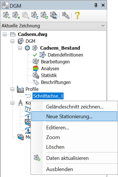 Zu jeder Schnittachse kann eine beliebige Anzahl von Stationierungen erstellt werden. Jede Stationierung wird dabei als eigener Gliederungspunkt im Projektbrowser, unterhalb der Schnittachse, dargestellt. Änderungen am Verlauf der Schnittachse wirken sich auch automatisch auf die referenzierten Stationierungen aus und werden optional automatisch aktualisiert.