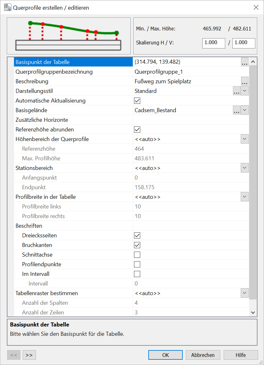 Die Optionen für die Erstellung von Querprofilen befinden sich in einem Dialogfeld tabellarisch aufgelistet. Eine neue Querprofilgruppe wird über die Auswahl der zugehörigen Stationierung einer Schnittachse im Projektbrowser und anschließender Auswahl der Funktion Querprofil erstellen / editieren aus dem Kontextmenü erstellt.