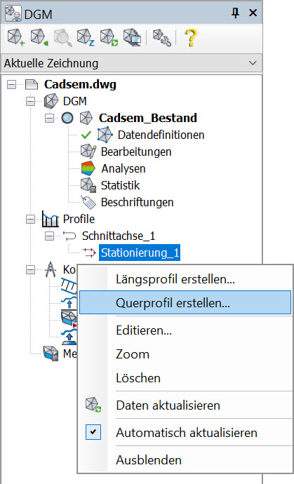 Zu jeder Schnittachse bzw. Stationierung kann eine beliebige Anzahl von Querprofilgruppen und somit Querprofilen, z. B. in verschiedenen Maßstäben, erstellt werden. Jede Querprofilgruppe wird dabei als eigener Gliederungspunkt im Projektbrowser, unterhalb der Stationierung, dargestellt. Änderungen am Verlauf der Schnittachse wirken sich auch automatisch auf die referenzierten Stationierungen und somit auf die Querprofilgruppe aus und werden optional automatisch aktualisiert.