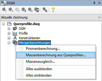 Eine neue Massenberechnung aus Querprofilen wird über die Auswahl des Menüpunktes Mengenberechnungen und anschließender Auswahl der Funktion Massenberechnung aus Querprofilen aus dem Kontextmenü erstellt. Dabei wird ein neuer Eintrag im Projektbrowser erstellt und es öffnet sich der Dialog Massenberechnung aus Querprofilen. |