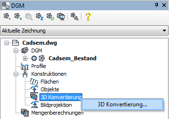 Eine neue 3D Konvertierung wird über die Auswahl des Menüpunktes 3D Konvertierung und anschließender Auswahl der gleichnamigen Funktion aus dem Kontextmenü erstellt. Der Befehl kann auch direkt aus der Multifunktionsleiste oder aus dem Pull-down-Menü gewählt werden. Hierbei entsteht kein neuer Eintrag im Projektbrowser, da die erzeugten Objekte keine DGM-Daten mehr besitzen. |
