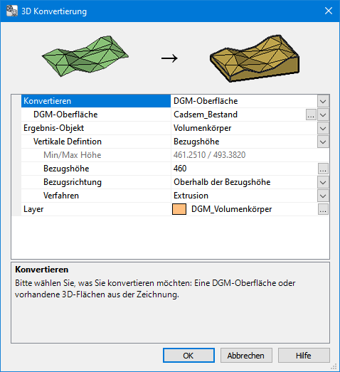 Die Konvertierung wird durch einen multifunktionalen Dialog eingeleitet, welcher auch die gewählten Optionen visuell unterstützt. Wählen Sie bitte zunächst die Quelle für die Konvertierung aus. Die Funktion unterstützt sowohl die automatisierte Konvertierung einer gesamten DGM-Oberfläche als auch gewählter 3D-Flächen.