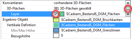 Die Objektwahl erfolgt nach Betätigung der gepunkteten Schaltfläche [...], wobei anschließend die Anzahl der gültigen 3D-Flächen angezeigt wird. Bei der Wahl von 3D-Flächen lässt sich der auszuwählende Layer bei Bedarf selektieren. Hierzu ist die Liste der sichtbaren Layer mit Hilfe der Klappliste zu wählen und das Häkchen zu aktivieren. Ein nicht aktiviertes Häkchen bedeutet, dass alle sichtbaren Layer bei der Auswahl berücksichtigt werden können. |