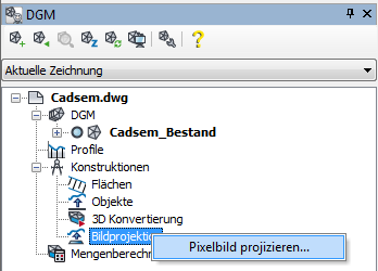 Eine Bildprojektion wird über die Auswahl des Menüpunktes Bildprojektion und anschließender Auswahl der Funktion Pixelbild projizieren aus dem Kontextmenü erstellt. Der Befehl kann auch direkt aus der Multifunktionsleiste oder aus dem Pull-down-Menü gewählt werden. Hierbei entsteht kein neuer Eintrag im Projektbrowser, da die erzeugten Objekte keine DGM-Daten mehr besitzen. |