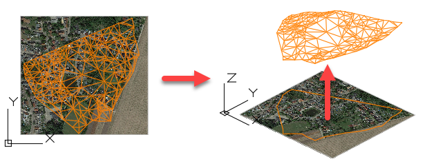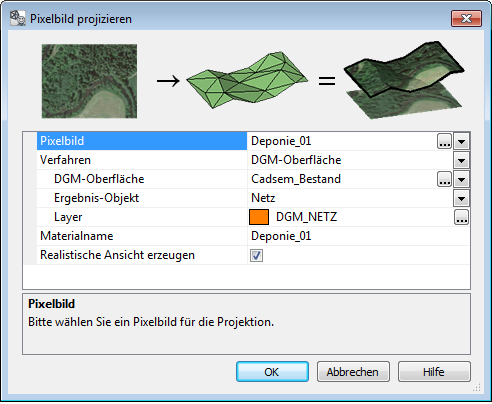 Anmerkung: Wenn das Bild kleiner als die DGM-Oberfläche ist, erfolgt die Projizierung nur auf die von dem Bild abgedeckte Fläche. Ist die Fläche des Bildes größer als die der DGM-Oberfläche, wird das Bild entlang der DGM-Begrenzung abgeschnitten. |