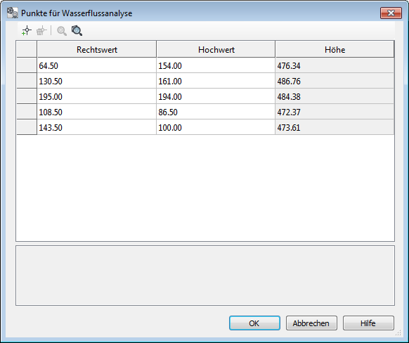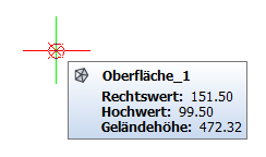 Bei Auswahl der Option gewählte Punkte wird ein zusätzliches Dialogfeld für die Punktverwaltung geöffnet. Die einzelnen Punkte können dann mit den Funktionsschaltflächen im oberen Teil des Dialogs hinzugefügt, geprüft, bearbeitet oder gelöscht werden. Während der Auswahl der Punkte innerhalb der Zeichnung, wird ein Tooltipp mit den Informationen Koordinaten, Höhe und Geländeoberfläche eingeblendet. Die Spurlinien werden auf einem separaten Zeichnungslayer erstellt. |