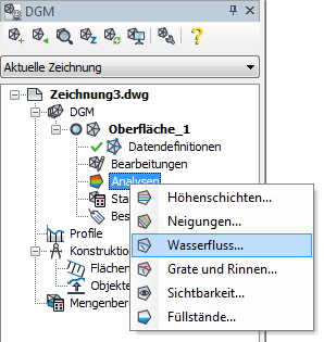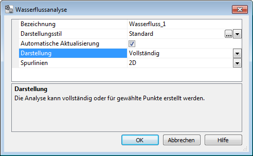 Alle Optionen für die Ausgabe der Analyse Wasserfluss befinden sich im Dialogfeld Wasserflussanalyse, welches über das Kontextmenü unter Analysen geöffnet wird. Im Dialogfeld stehen die Funktionen tabellarisch zur Verfügung. Jede Analyse erhält eine Bezeichnung, die automatisch vom Programm vorgegeben wird und benutzerdefiniert geändert werden kann. Die Darstellung in der Zeichnung ist abhängig vom ausgewählten Darstellungsstil. Analysen können optional automatisch aktualisiert werden, wobei Änderungen an der Geländeoberfläche direkt nachgeführt werden, was aber bei großen Geländemodellen Rechenzeit beanspruchen kann. Die Darstellung der Spurlinien kann optional in 2D oder 3D erfolgen, wobei die gesamte Oberfläche (vollständig) oder nur gewählte Punkte analysiert werden können.