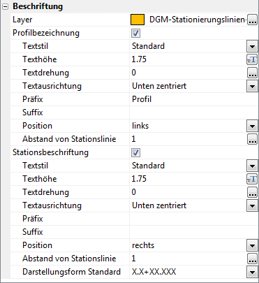 Die Beschriftung der Stationierungen erfolgt getrennt für Profilbezeichnungen und Stationsbeschriftungen. Für beide Textkomponenten lassen sich Textstil, Texthöhe, - drehung u. -ausrichtung, Präfix, Suffix, die Position und der Abstand von der Stationierungslinie festlegen. Für die Darstellungsform der Stationswerte stehen 3 Varianten zur Verfügung. |