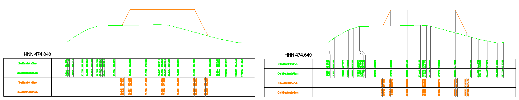 Beschriftungslinien werden für die Kennzeichnung von Maßtexten zwischen Geländeverlauf und Zahlenwerten in Tabellenzeilen verwendet um eine bessere Zuordnung zu gewährleisten. Die Ausgabe der Beschriftungslinien erfolgt an den Stützpunkten der Geländelinie und Bruchkantenpunkten.