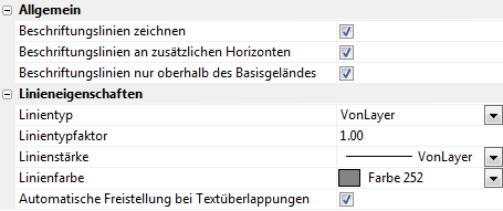Für die Beschriftungslinien lassen sich Allgemein folgende Einstellungen vornehmen: