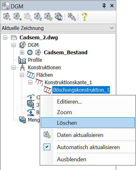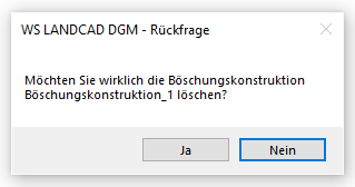 Wurden mit einer Böschungskonstruktion automatisch weitere DGM-Flächen erstellt, erscheint zusätzlich eine weitere Rückfrage, ob diese ebenfalls gelöscht werden sollen. Ein Behalten der Flächen kann z. B. Sinn machen, wenn die Konstruktion nur einen Zwischenschritt darstellte und keine diesbezügliche Abhängigkeit mehr benötigt wird.