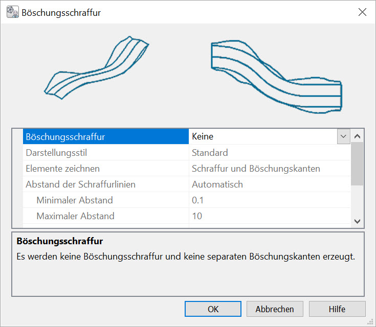 Durch die Aktivierung einer Böschungsschraffur werden weitere Einstellungsmöglichkeiten im Dialog Böschungsschraffur freigegeben: