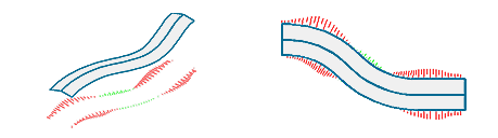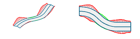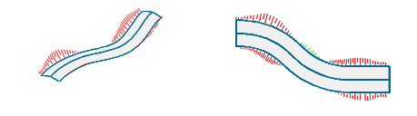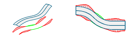 Die entlang der Profilachse rechnerisch eingefügten Profile werden automatisch auf die jeweilige DGM-Fläche geböscht, wodurch zwangsweise Böschungsflächen entstehen, die sich bei Bedarf durch Böschungsschraffuren darstellen lassen. Böschungsschraffuren sind v. a. für die Darstellung in Lageplänen vorgesehen, können aber auch bei gerenderten 3D-Ansichten unterstützend eingesetzt werden. |