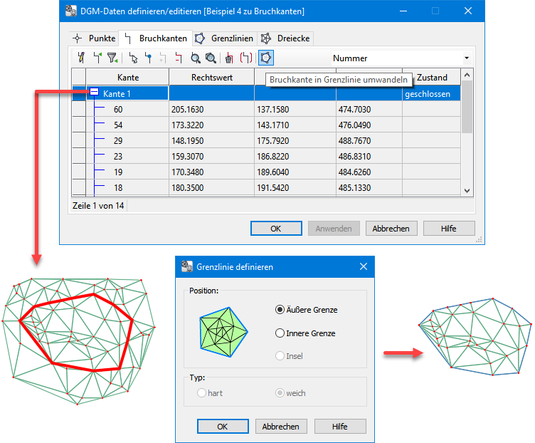 Dieser Befehl ermöglicht die Umwandlung einer Bruchkante in eine Grenzlinie und wird daher nur eingeblendet, wenn genau eine geschlossene Bruchkante ausgewählt ist.