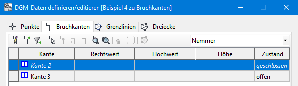 Die Bruchkante verbleibt weiterhin in der Fläche. Im Bruchkanteneditor wird der Kantenname nun kursiv dargestellt, um darauf hinzuweisen, dass diese Bruchkante gleichzeitig eine Grenzlinie ist. Eine solche Bruchkante kann nicht editiert oder gelöscht werden. Wenn Sie dies beabsichtigen, müssen Sie zuvor die Grenzlinien-Referenz entfernen.