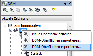 DGM Oberflächendaten einer Zeichnung werden mit dieser Funktion in eine XML-Datei exportiert. Hierfür steht die Funktion im Kontextmenü des Gliederungspunktes DGM des Projektbrowsers zur Verfügung. Das Ausgabeformat entspricht dem Formattyp LandXML. |