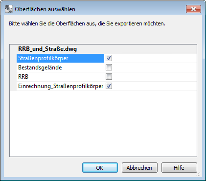 Nach Auswahl und Benennung der entsprechenden XML-Datei werden in einem Dialogfeld alle exportierbaren Oberflächen der Zeichnung angezeigt. Es können eine oder mehrere DGM-Oberflächen für den Export ausgewählt werden.