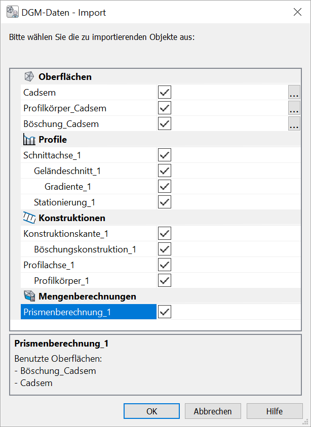 Hinweis: Alle DGM-Daten sind an die jeweiligen Oberflächen gebunden. Zum Import von abgeleiteten Objekten und Berechnungen müssen daher die daran beteiligten Oberflächen ebenfalls importiert werden. Dies wird dadurch erleichtert, dass jeweils benutzte Oberflächen im Dialog angegeben werden, wenn auf ein Objekt geklickt wird. |