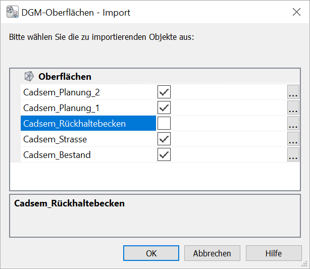 Alle Oberflächen werden mit dem zuletzt gespeicherten Status der Elementanzeige (Punkte, Bruchkanten, Grenzlinien, Dreiecksvermaschung, Isolinien) nach dem Import angezeigt. Die Eigenschaften der Flächendefinition können jedoch vor dem Import neu festgelegt werden, wenn die gepunktete Schaltfläche [...] aktiviert wird.
