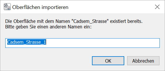 Wenn die Bezeichnung der zu importierenden Oberfläche bereits in der Zeichnung vorhanden ist, wird ein zusätzlicher Dialog eingeblendet, welcher zur Überprüfung der Bezeichnung auffordert. Hierbei wird die importierte Oberfläche als Vorschlag mit einem numerischen Suffix versehen, damit keine Namensgleichheit entsteht.