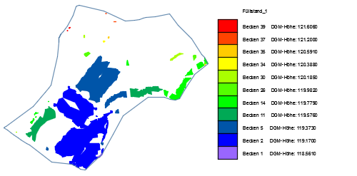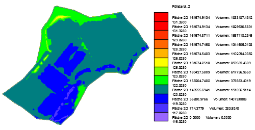 Die Darstellung beider Füllstandsanalysen kann als Keine, Isolinienplan oder Isolinienplan mit Flächenfüllung erfolgen. Die Darstellung der grafischen Ergebnisse erfolgt als zusammengefasster Block. |