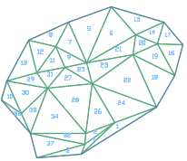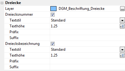 Dreiecksbeschriftungen werden für die Ausgabe von Textinformationen an jedem einzelnen Dreieck der aktuellen Oberfläche verwendet. Für die DGM-Dreiecksbeschriftungen können der Layer sowie der Textstil und die Texthöhe festgelegt werden. Für Dreiecke können die Dreiecksnummer sowie die Dreiecksbezeichnung beschriftet werden.