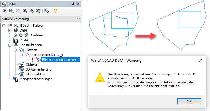 Durch das Editieren der Konstruktionskante kann das Resultat einer bereits vorhandenen Böschungskonstruktion möglicherweise nicht mehr erstellt werden, z. B. weil die Böschung über den Rand der Oberfläche hinausgehen würde. Dies kann mehrere Ursachen haben. Daher erscheint eine entsprechende Warnung. Das Resultat der Böschungskonstruktion (Polylinie, Böschungsschraffuren, Flächen) ist dann ungültig, was im Projektmanager durch ein rotes Ausrufungszeichen (!) signalisiert wird. Da keine automatische Aktualisierung erfolgen kann, werden Polylinien, Böschungsschraffuren und die Objekte von Flächen gelöscht.
