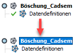 Enthält das Resultat einer assoziativen Böschungskonstruktion eine oder zwei automatisch erstellte Oberflächen, werden alle diesbezüglichen Objekte ebenfalls in der Zeichnung gelöscht. Die Flächendefinitionen selbst verbleiben aber in der Zeichnung, solange nicht die Böschungskonstruktion oder die Flächen selbst ganz gelöscht werden. Dies ist im Projektbrowser auch daran zu erkennen, dass das grüne Häkchen vor der Datendefinition fehlt. |