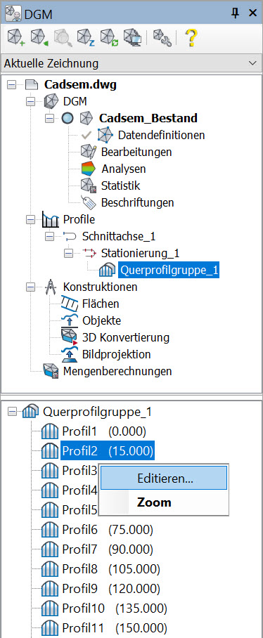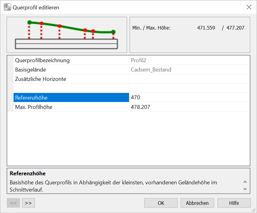 Das Editieren eines einzelnen Querprofils einer Querprofilgruppe erfolgt mit Hilfe des Dialogs Querprofil editieren. Die Editierfunktion wird über das Kontextmenü am ausgewählten Querprofil im Projektbrowser zur Verfügung gestellt.