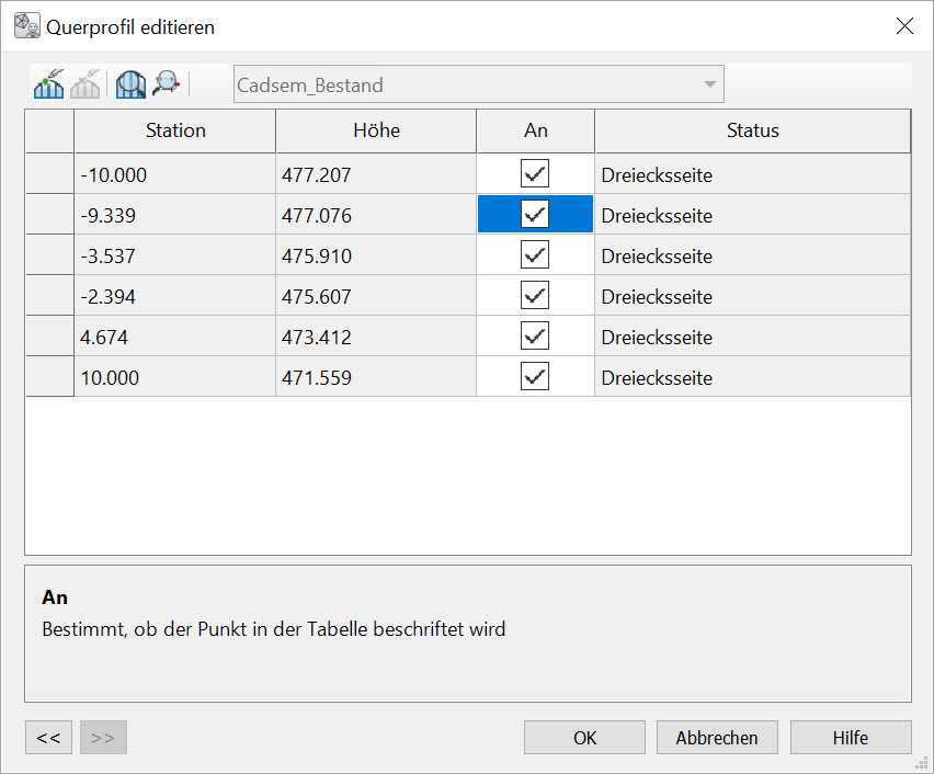 Die Beschriftungen am einzelnen Querprofil lassen sich auf der zweiten Seite des Dialogs separat ein- oder ausschalten. In der Statusspalte steht dazu der Status des Beschriftungstyps, an dem zu erkennen ist, ob es sich bei der Beschriftung z. B. um einen Schnitt mit einer Dreiecksseite oder einer Bruchkante handelt. Die Datenspalten lassen sich bei Bedarf sortieren, wenn mit dem Cursor in die Spaltenbezeichnung geklickt wird.