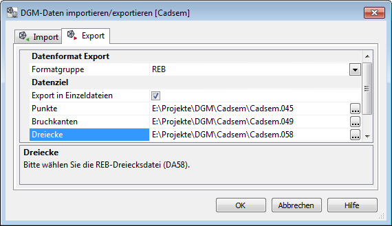 - REB-Dateien – REB-Dateien verfügen über Datenarten, die von der Bundesanstalt für Straßenwesen normiert sind. Im Gegensatz zu einfachen Punktdateien können die vom DGM exportierten Datenarten nicht nur Punkte, sondern auch Linienverbindungen (Bruchkanten) und Dreiecke enthalten.