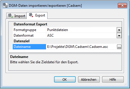 Im Dialog DGM-Daten importieren/exportieren ist nach der Aktivierung des Registers Export, zunächst der Eintrag Punktdateien aus der Klappliste zur Formatgruppe zu wählen. Anschließend kann eines der unterstützten Datenformate ausgewählt werden.