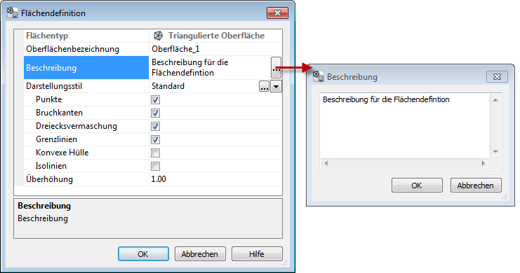 - Beschreibung – Zur Oberfläche kann ein mehrzeiliger Beschreibungstext eingegeben werden, um die Fläche näher zu charakterisieren. Die Beschreibung kann entweder direkt in das Eingabefeld oder in den Zusatzdialog Beschreibung eingetragen werden.