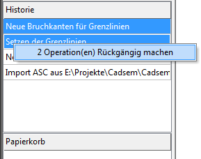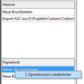 Für den Papierkorb gilt die gleiche Konvention. Durch Anklicken eines Feldes und Aufruf des Kontextmenüs lässt sich eine Operation wiederholen. Auch hier wird wieder die Rangfolge eingehalten, d. h. es wird der Bereich bis zur ersten Zeile markiert und ausgeführt. Dadurch wandern die entsprechenden Zeilen wieder an die oberste Stelle der Historie. Durch diesen komfortablen Mechanismus können |