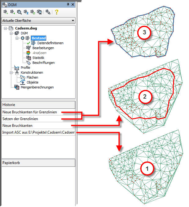 Das DGM verwendet eine separate, vom CAD-System völlig unabhängige Historie zu jeder DGM-Fläche. Dies bedeutet, dass jede Aktion, die zur Erstellung oder Änderung eines TINs führt, so lange protokolliert wird, bis die Zeichnung geschlossen wird.