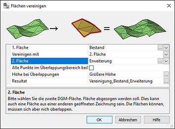 Der Vorgabename für die resultierende Fläche wird stets aus dem Namen der beiden Flächen und dem Präfix Vereinigung_ gebildet. Dies ist eine automatische Komfortfunktion. Einen davon abweichenden Namen sowie alle weiteren Eigenschaften der Fläche können durch Aktivierung der gepunkteten Schaltfläche […] erfolgen, welche den Dialog Flächendefinition für die neu zu erzeugende Fläche öffnet.