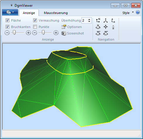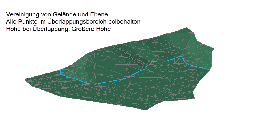 Die nachfolgende Abbildung zeigt ein typisches Beispiel der Vereinigung zweier Flächen mit Berücksichtigung der größeren Höhen und deaktivierter Beibehaltung aller Punkte im Überlappungsbereich: